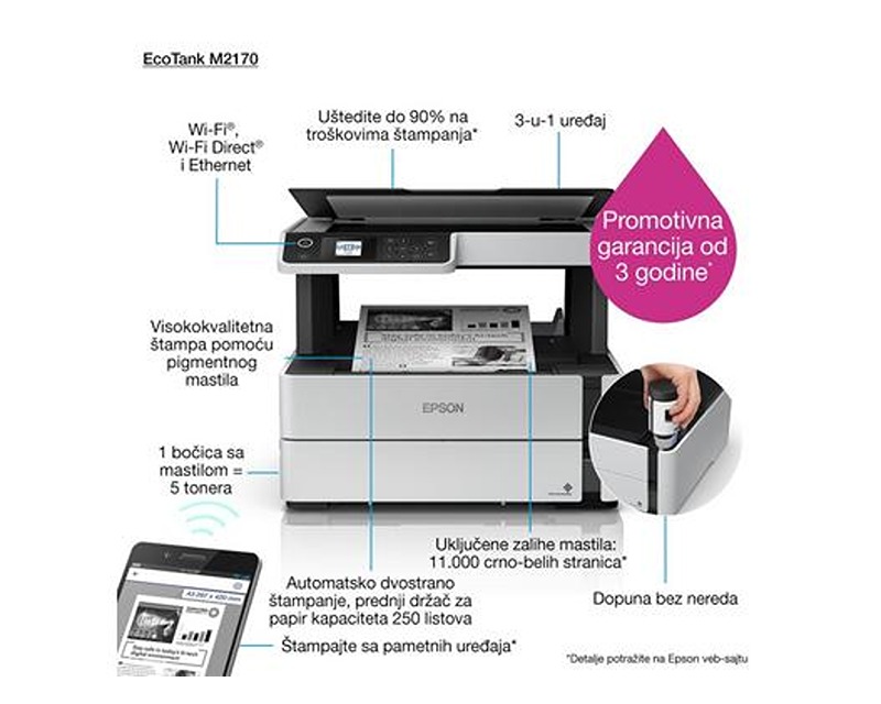 | Napomena | Ostvarite dodatnih 24 meseca garancije, ili 100 000 strana, prijavom na sajtu https://www.epson.eu/en_EU/promotions/extended-warranty |