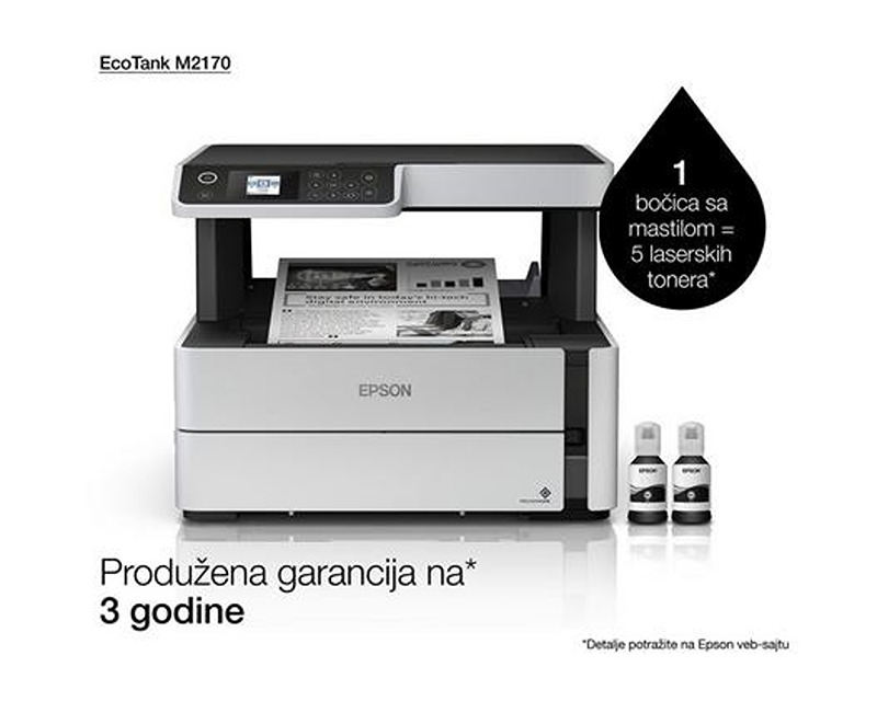 Epson M2170 je profesionalni 3-u-1 monohromatski inkjet multifunkcijski uređaj sa EcoTank sistemom i Wi-Fi dizajniran za male i srednje kancelarije sa intenzivnim obimom crno-bele štampe. Kombinuje štampač, skener i kopir u super-brzom, dupleks i ekonomičnom sistemu bez ketridža.